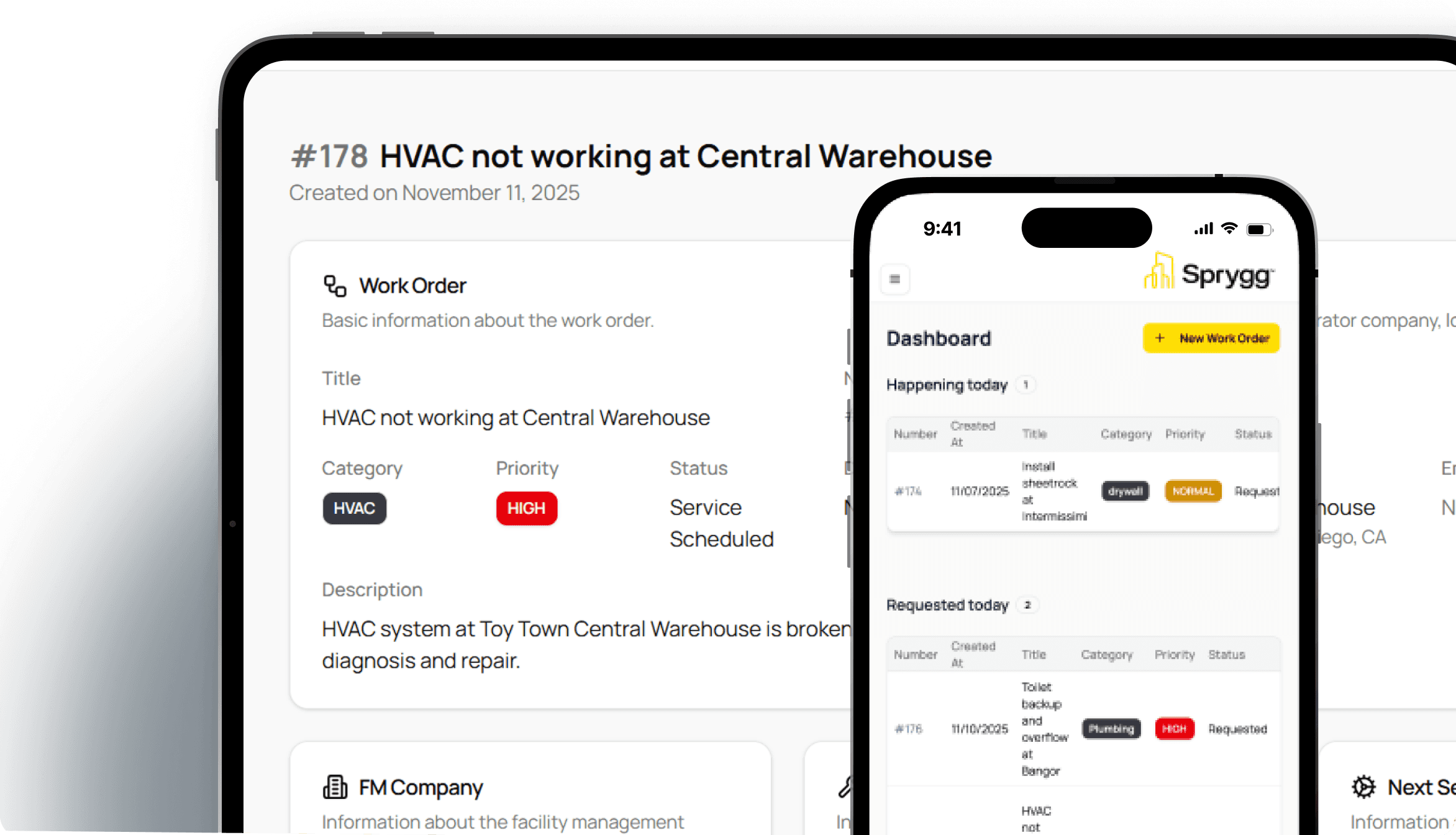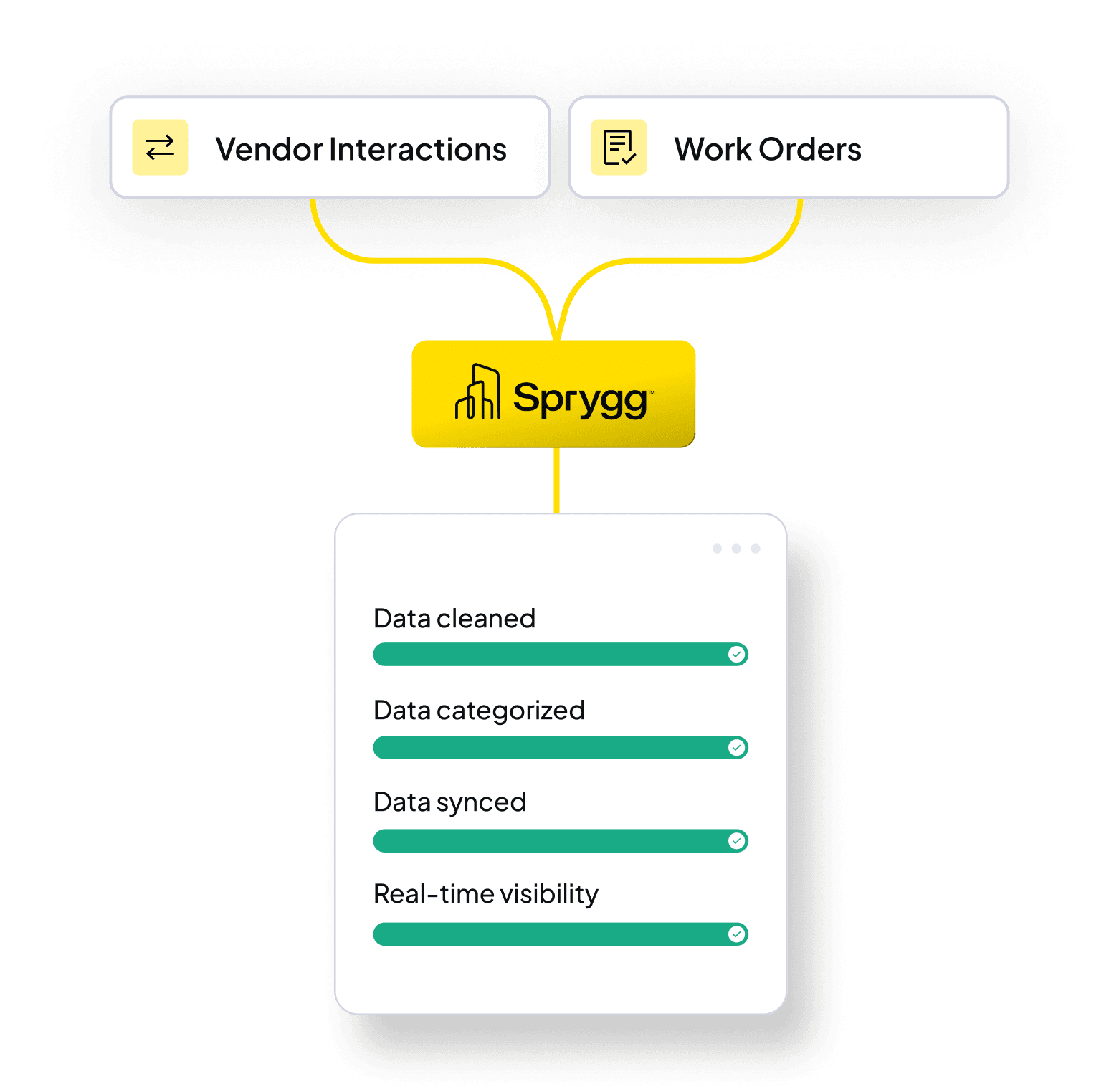 Sprygg captures data from every vendor interaction and work order, then automatically cleans, categorizes, and syncs it across your existing systems. This gives you real-time visibility into costs, response times, and asset performance. Finally make decisions based on complete information rather than fragmented spreadsheets and guesswork.